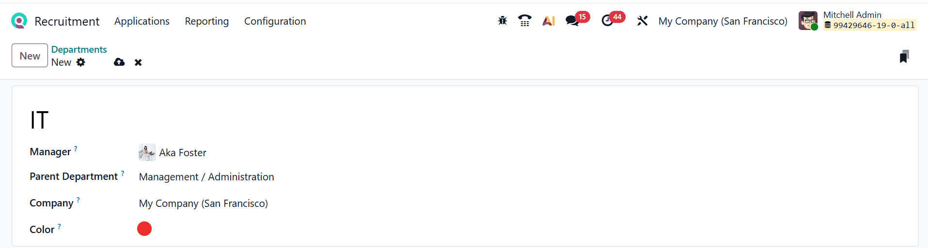 Then, enter a title for the department and add the following details such as Manager, Parent Department, Company, and Color as shown below: