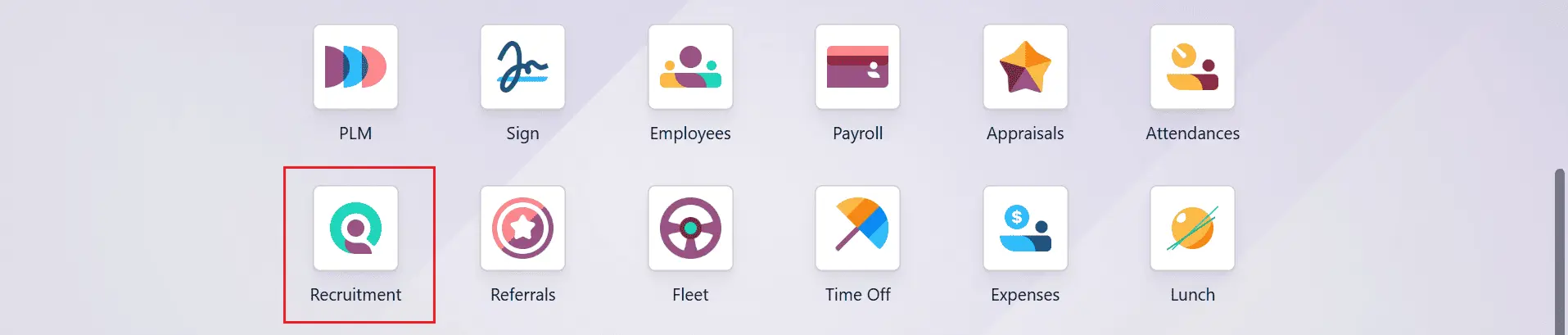 To set up company departments in Odoo 19, navigate to the Recruitment module from Odoo 19.