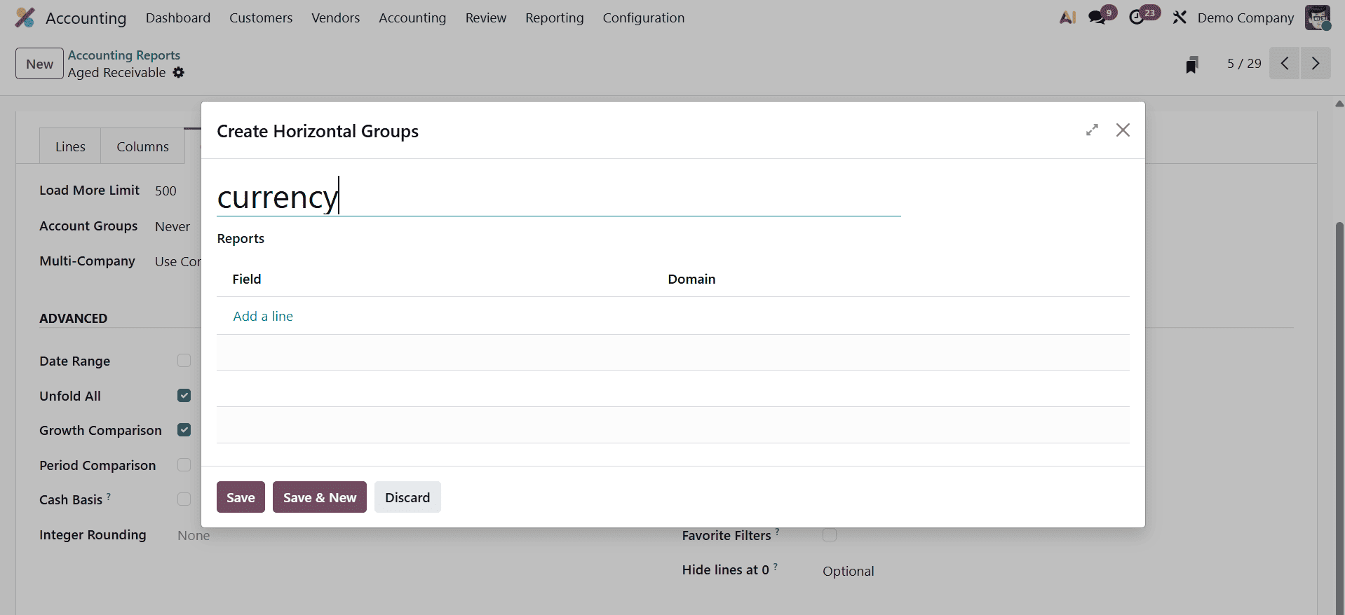 If the Zero function is enabled, the line will be hidden automatically if all Odoo columns show zero. You can define the Label, Formula, Subformula, and Computation Engine by clicking the Add a Line button. You can see the newly created line in the Aged Receivable report as shown below.