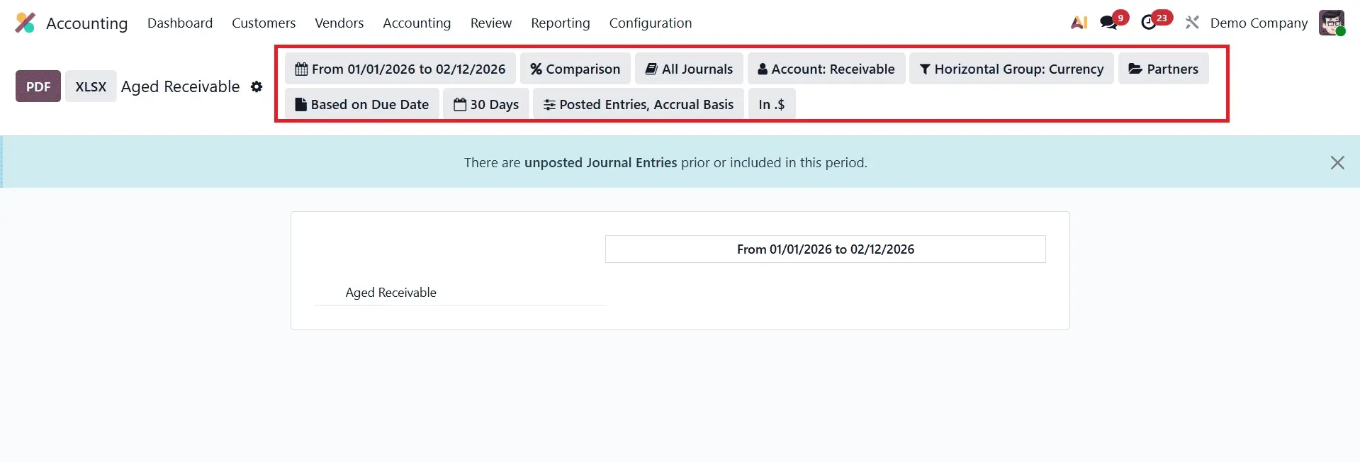 To add even more filters to your report, you can go to the Filters section and activate Account Types, Journals, Partners, Draft Entries, and Unreconciled Entries.